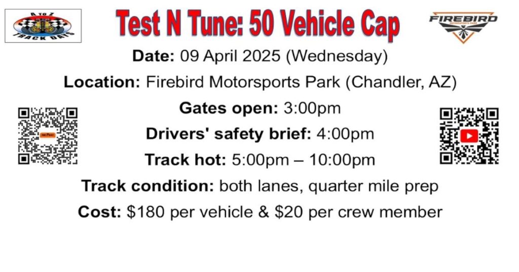 50 max vehicle count ensures maximum amount of track time! Complete NHRA license passes! Soft tires only, must be classified as Drag Radial, Slick, or Tread Wear rating of 200 or less.